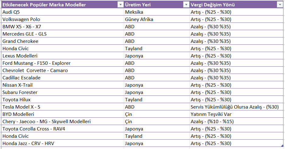 Ayrıca, Meksika ve Güney Afrika gibi yerlerden gelen ve %10’luk avantajlı dilimde olan Audi Q5 (Meksika) ve Volkswagen Polo (Güney Afrika) gibi modeller de artık %35’i aşan yeni vergi oranlarıyla karşı karşıya kalacak.
